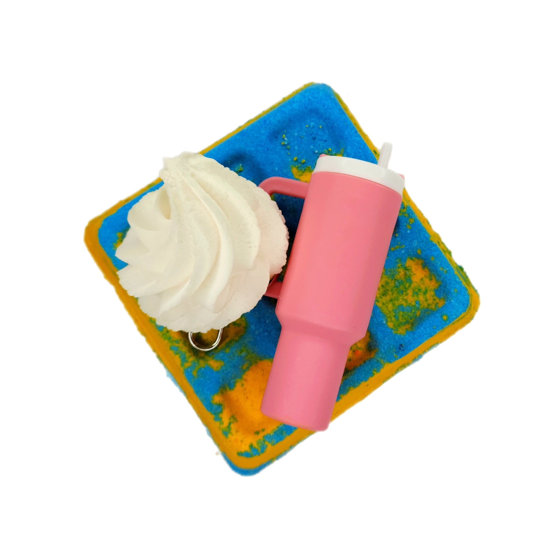 This hand-crafted waffle bath bomb is topped with fluffy bubble frosting and finished with the cutest mini tumbler cup keychain you can keep after your soak! πΉβ¨